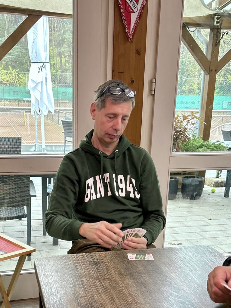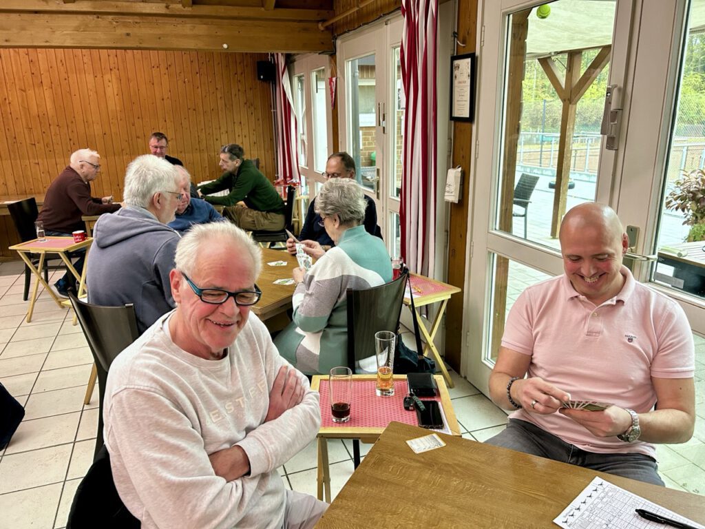 An den Spieltischen wurde dann mit guter Laune gereizt, gewonnen und auch manchmal verloren. Die 4er-Tische spielten eine 60er Serie, während die 3er-Tische eine 45er Serie absolvierten. Ein besonderes Highlight war ein Grand Ouvert, den Gunnar trotz hoher Risiken und in der Hinterhand erfolgreich für sich entschied.